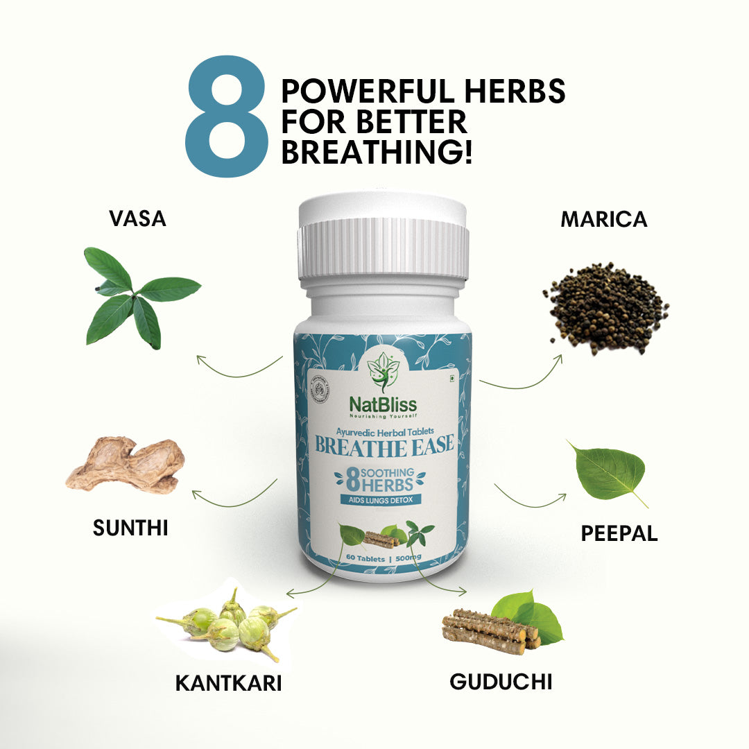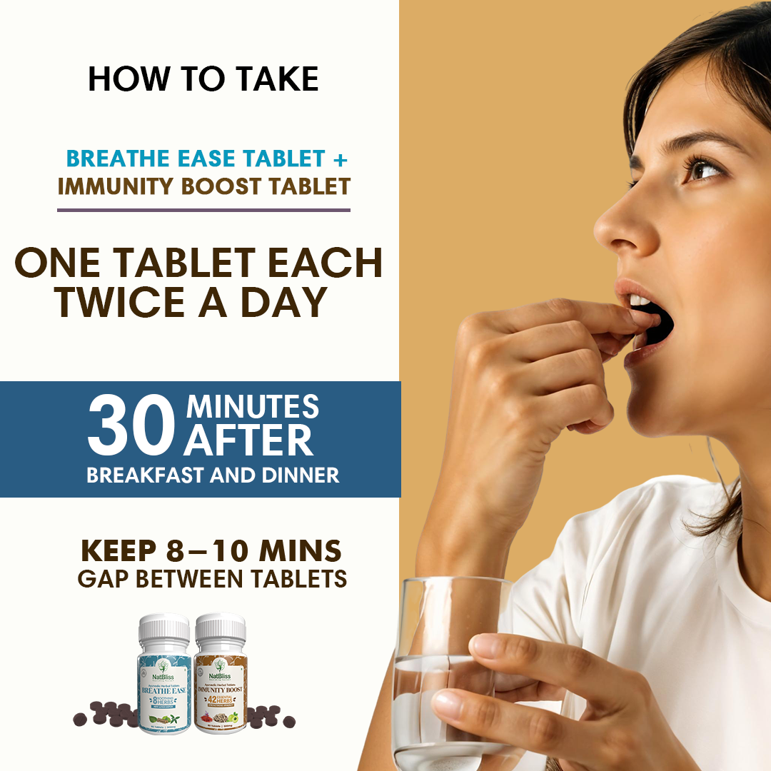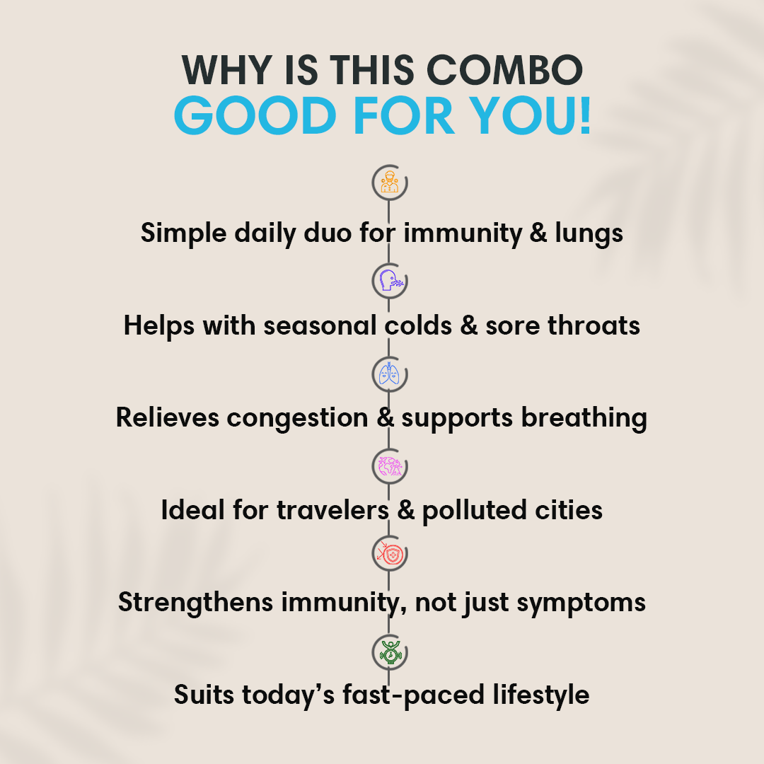This powerful Ayurvedic combo brings together the best of respiratory and immune support in one daily routine. Breathe Ease Tablets help clear airways, reduce congestion, and support lung function, while Immunity Boost Tablets strengthen your body’s natural defense against infections, pollution, and seasonal illnesses. Together, they make this the perfect combo for anyone facing frequent colds, allergies, or respiratory discomfort in today’s polluted, high-stress environment.