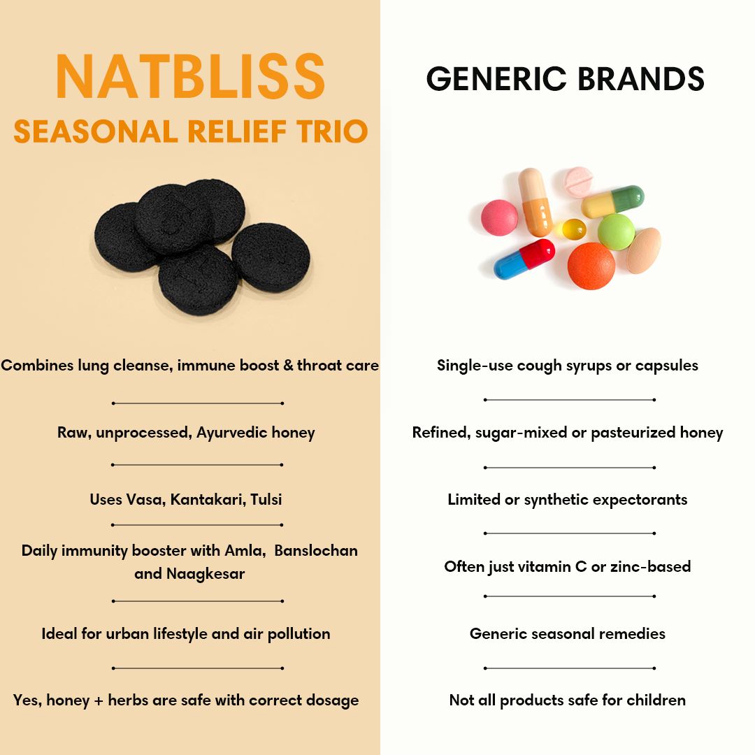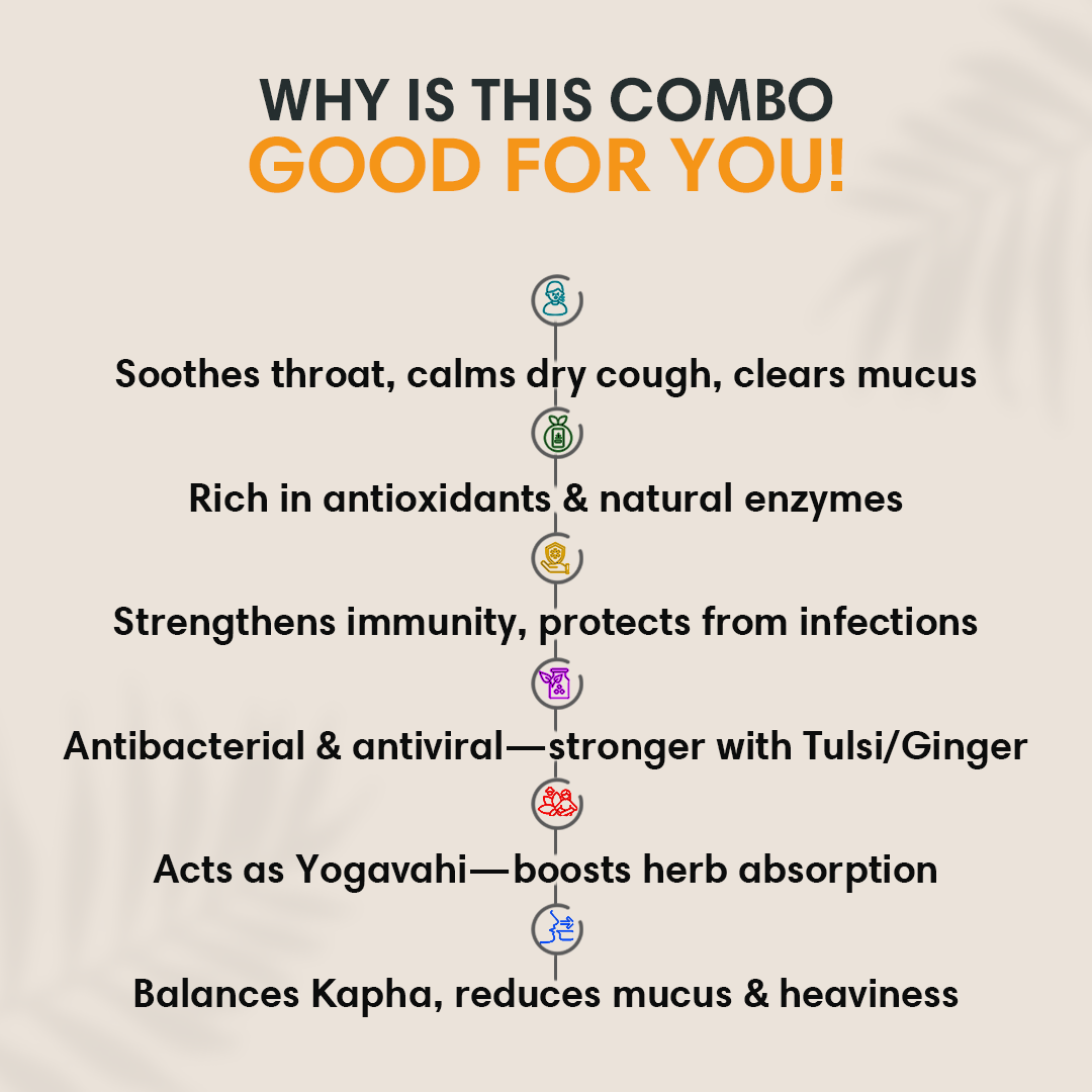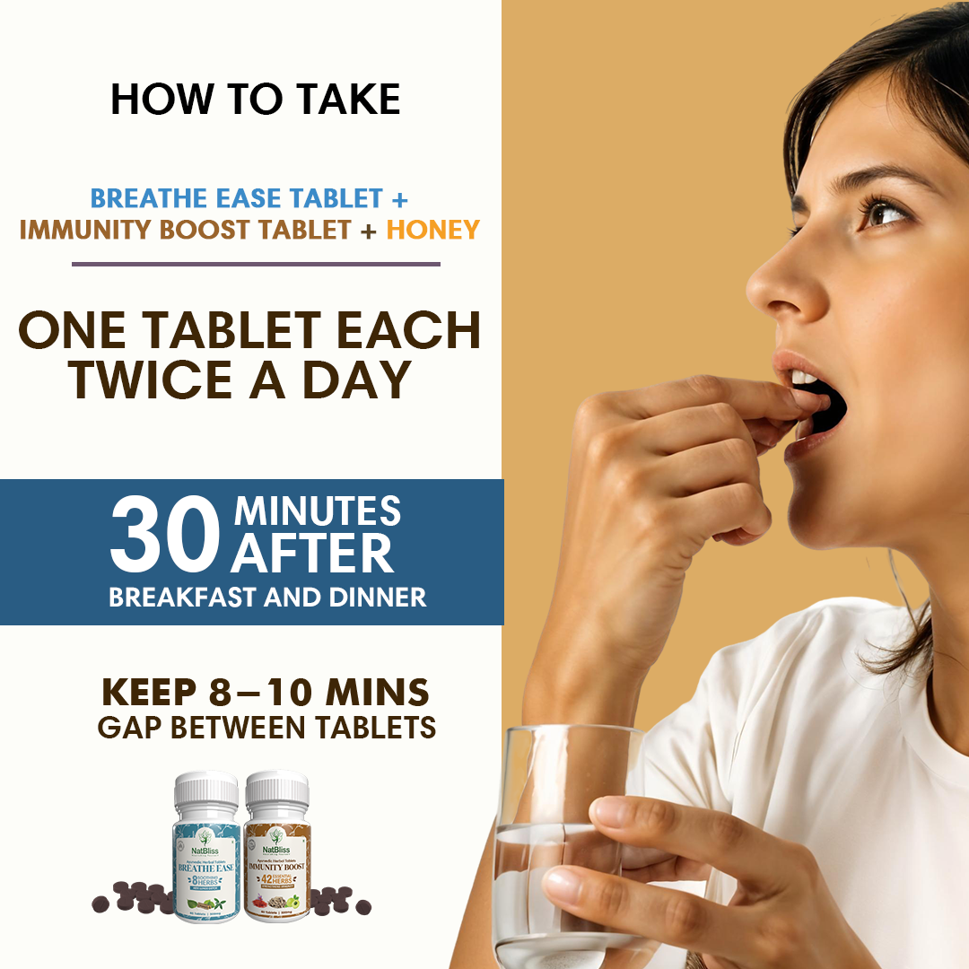 This Ayurvedic trio offers complete respiratory and immune support. Breathe Ease Tablets clear airways and ease breathing, Immunity Boost Tablets strengthen your body’s natural defenses, and Raw Honey soothes the throat while enhancing immunity. Together, they help fight pollution, infections, and seasonal allergies—naturally and effectively.