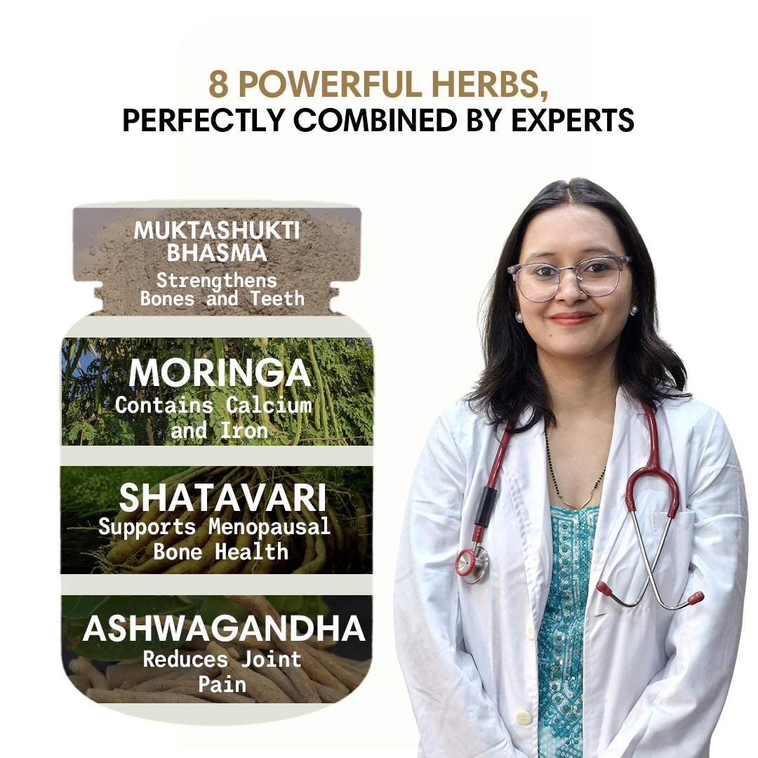 💪Made with 8 herbs like Til , Hadjod, muktashukti bhasma, shatavari, moringa, and others to strengthen bones.