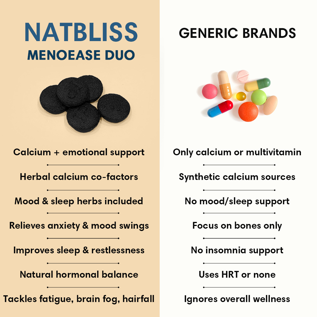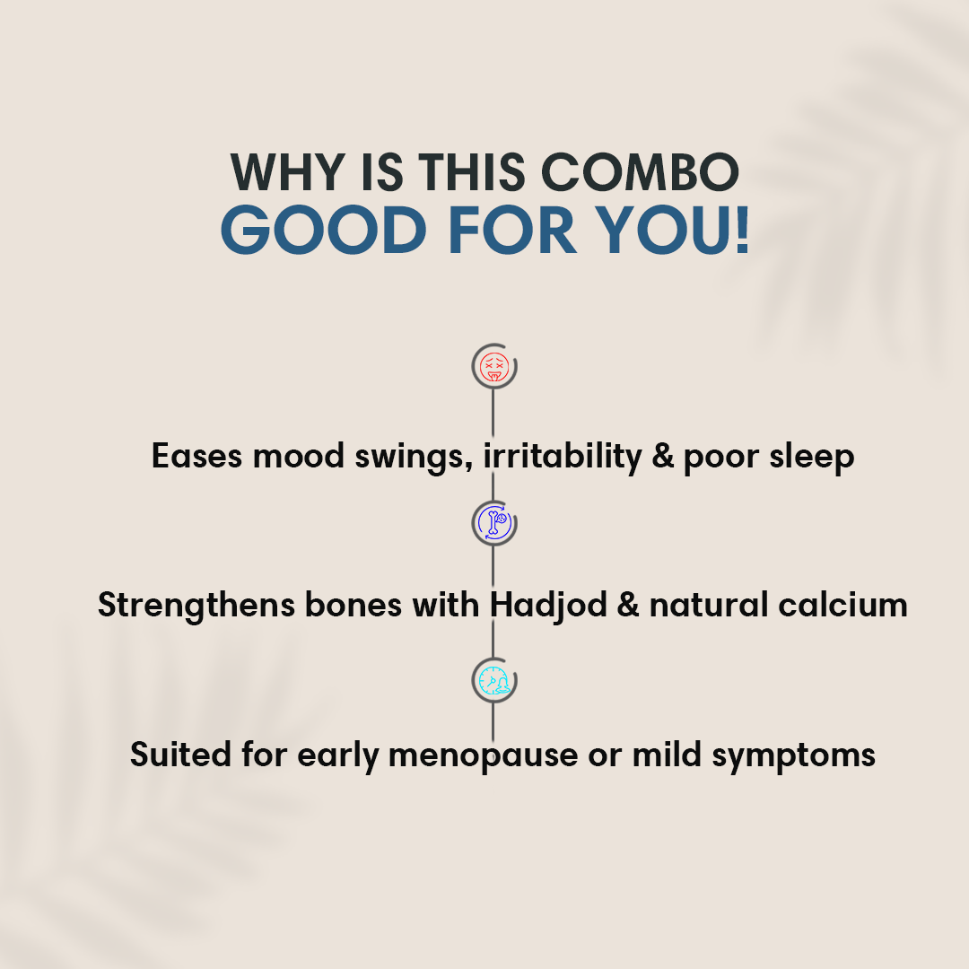 Menopause brings more than just physical changes—it affects mood, sleep, and overall well-being. This Ayurvedic combo combines CalciCare for natural calcium support and bone strength with CalmEase to ease mood swings, anxiety, and promote restful sleep. Designed specifically for menopausal and postmenopausal women, it fills key nutritional gaps, supports hormonal balance, and provides holistic emotional and physical relief—naturally.