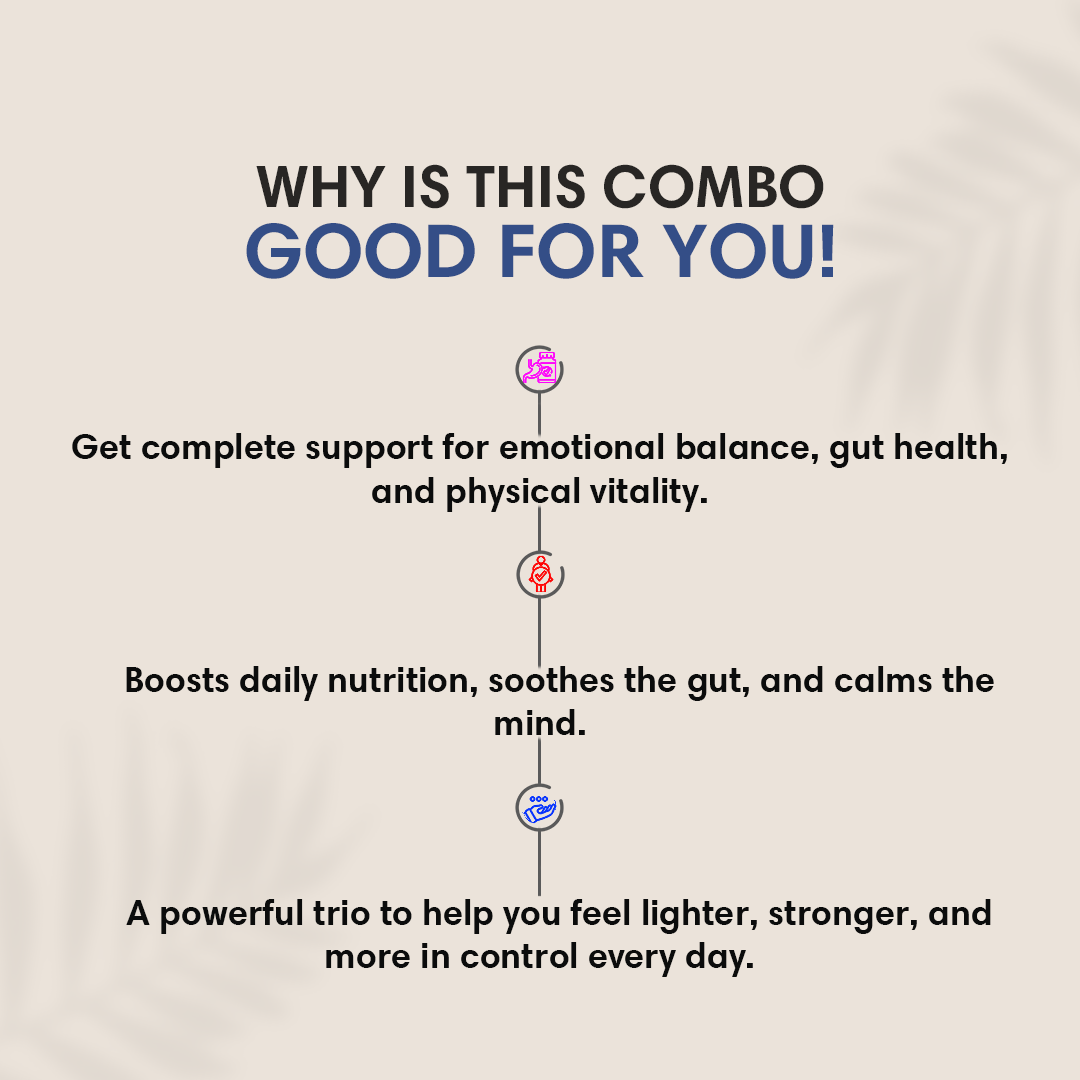 This is your ultimate Ayurvedic wellness trio—designed to calm the mind, soothe the gut, and nourish the body from within. Ideal for those struggling with fatigue, anxiety, bloating, or emotional burnout, this all-natural combo supports holistic health by targeting stress, digestion, and nutrient balance. Free from chemicals and side effects, it offers a safe, plant-based solution to restore energy, mood, and gut harmony—making it the perfect daily wellness support for modern lifestyles.