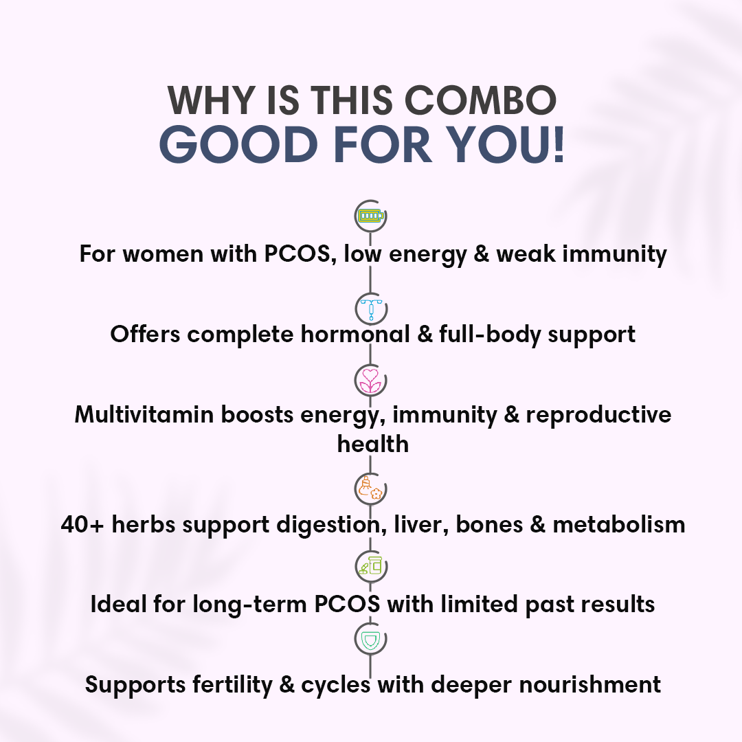 Specially crafted for women struggling with PCOS, this all-in-one Ayurvedic combo offers holistic, natural support to address the root causes—not just the symptoms. It helps balance hormones, regulate irregular periods, reduce facial hair, acne, and pigmentation, and promote clear, healthy skin. With herbs that aid metabolism and weight management, plus daily multivitamins to boost energy and fill nutritional gaps, it acts as a complete reset kit for your PCOS journey—rooted in tradition, backed by nature.