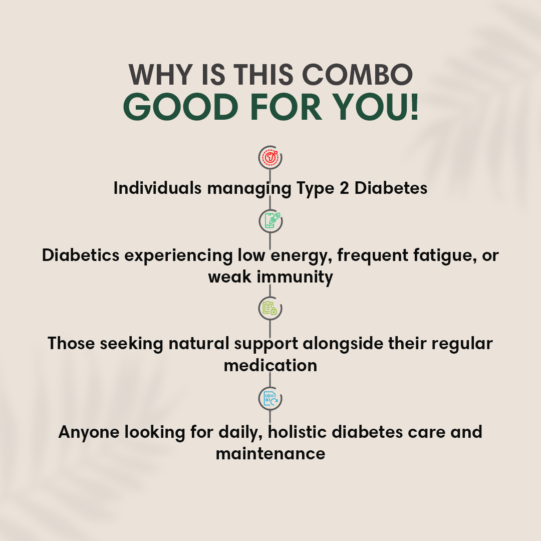 This Diabetes Care Combo is ideal for those managing diabetes for a while and seeking a natural yet effective solution. It combines a powerful sugar-control juice to help lower fasting blood sugar levels in the morning, easy-to-carry Sugar Ease tablets for post-meal support, and a potent multivitamin to help boost daily energy and immunity. A complete solution to help you reclaim balanced sugar levels, manage symptoms, and improve overall well-being—naturally.