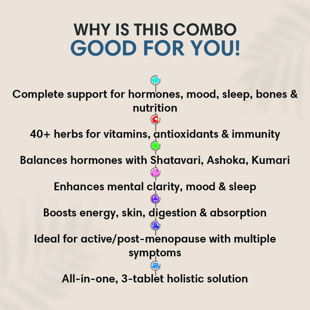 Experience calm, balance, and renewed energy during menopause with this powerful Ayurvedic Menopause Combo. Unlike synthetic HRT, it works holistically to balance hormones, ease mood swings, improve sleep, and support overall wellness. Made with natural, non-habit-forming herbs, it helps restore harmony between mind and body—gently and effectively.
